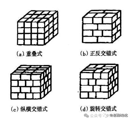由于這種碼垛方式各層排列相同,完全沒有交叉搭接,貨物單元往往容易縱向分裂,穩(wěn)定性不好。采取這種方式碼成高垛時,必須采取其它穩(wěn)定措施,通常采用加纏繞膜、加腰箍等方法加以固定。